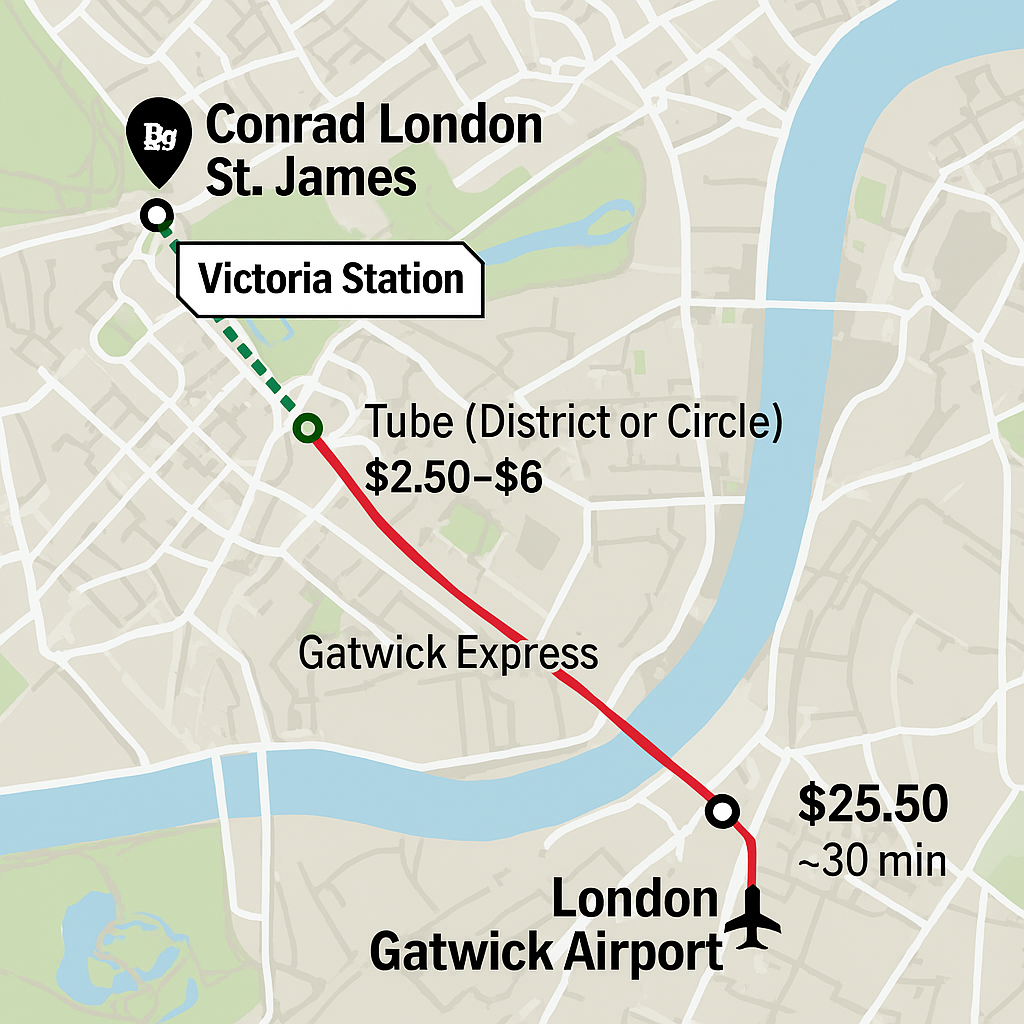 - Transit: ~75โ90 minutes by taxi; ~35 minutes via Gatwick Express from Victoria Station (which is very close to Conrad St. James).