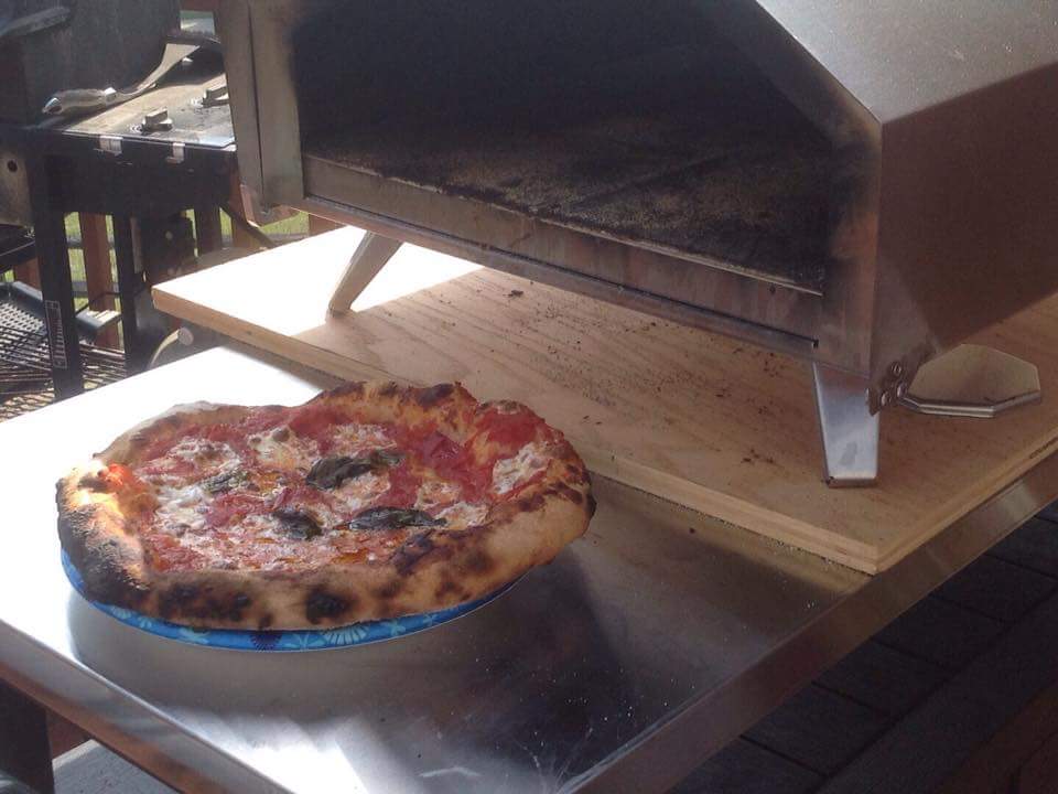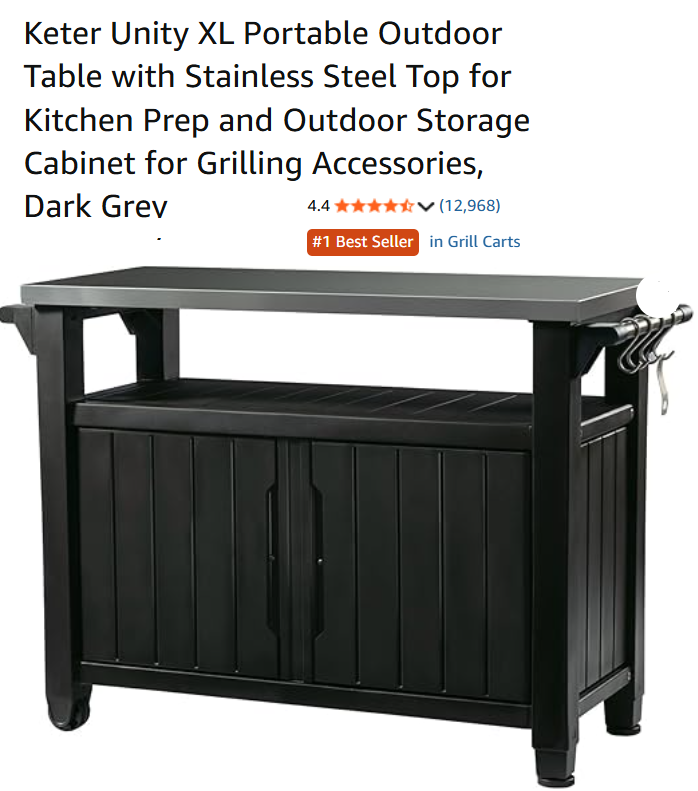 I have two of these, one by my grill and smoker as a prep and storage table, and the other on my deck being used as a table for my pizza oven. Buy here on Amazon.